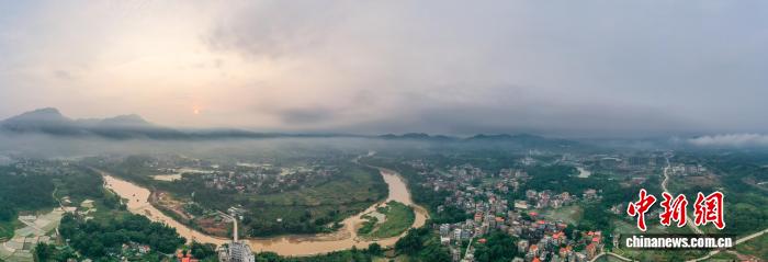 7月30日,航空照片of Yonggan村庄的景观来自广州市Nojo市的Sikiao County市。夏季结束的稻田就像明亮的镜子一样,乌云密布,城镇,河流和山脉上覆盖着雾气的雾气。 Li Jieyuan照片